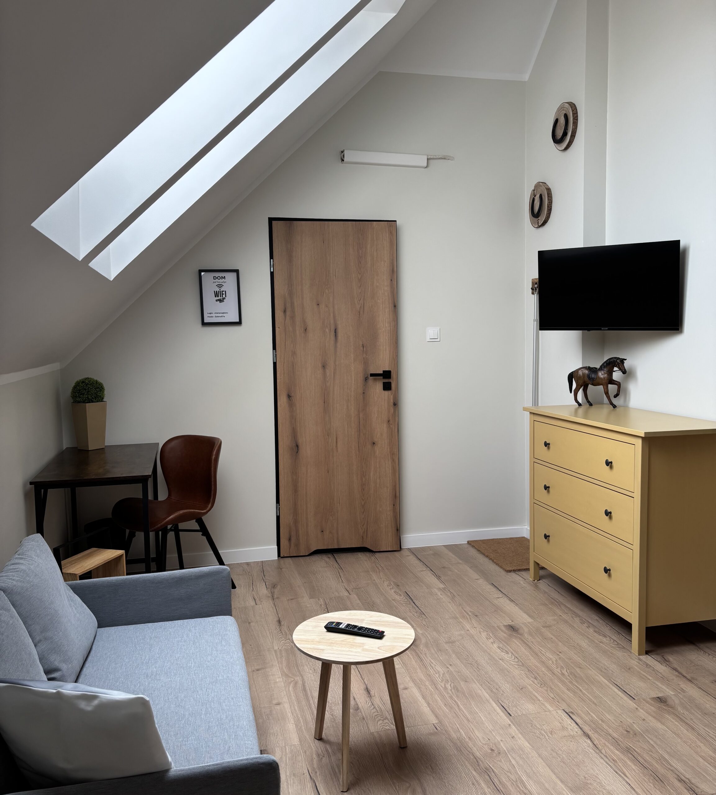 – pokój: TV 40″ z internetem , biurko, krzesło ,kanapa, 2 łóżka pojedyncze, pościel, stoliki nocne z lampkami i indywidualnymi gniazdkami elektrycznymi